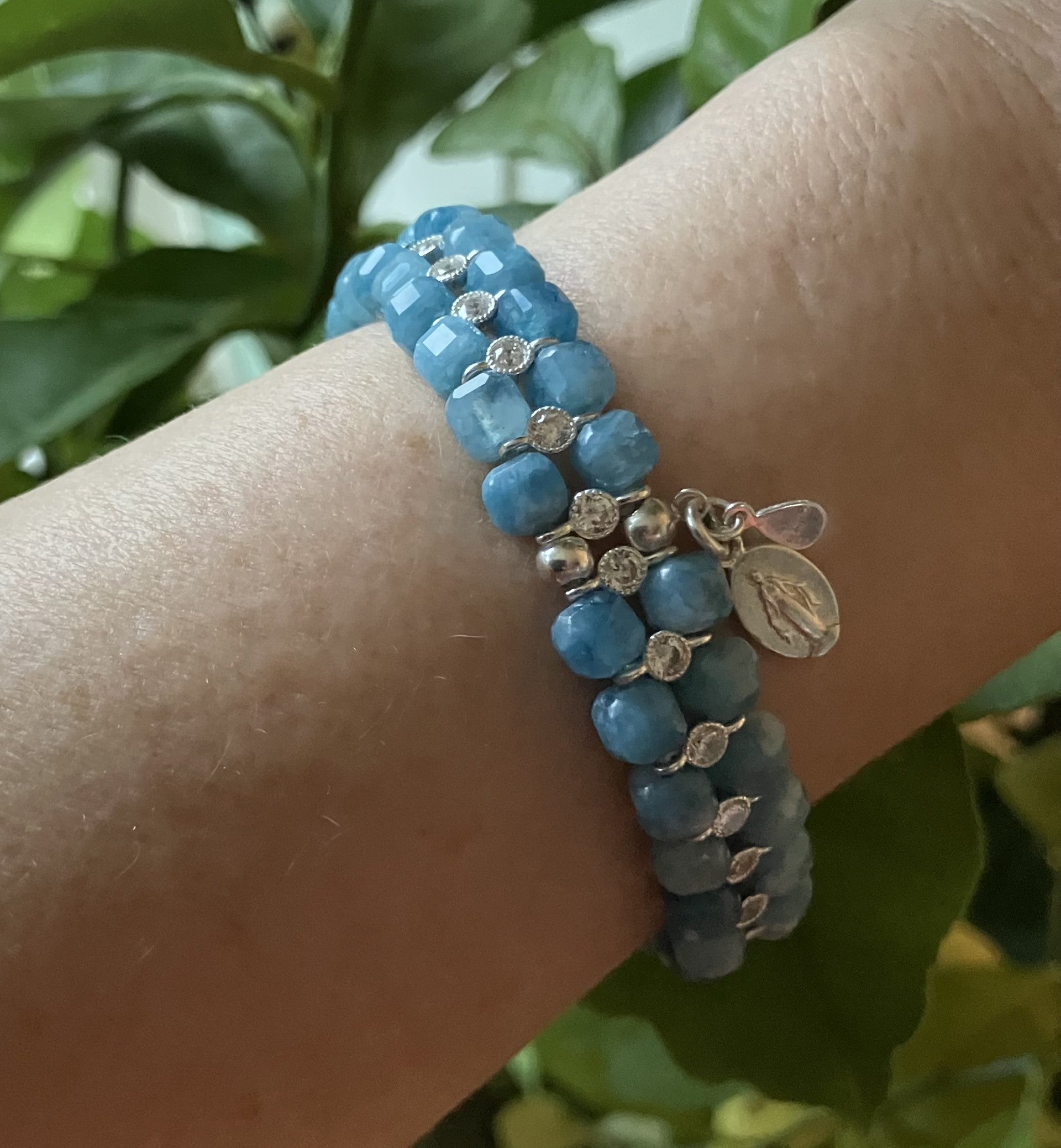 A beautiful bracelet with 5mm square facet cut Blue Chalcedony beads and 925 sterling silver. The bracelet is strung with 1mm thick elastic especially intended for luxurious jewelry, making it easy to wear.
