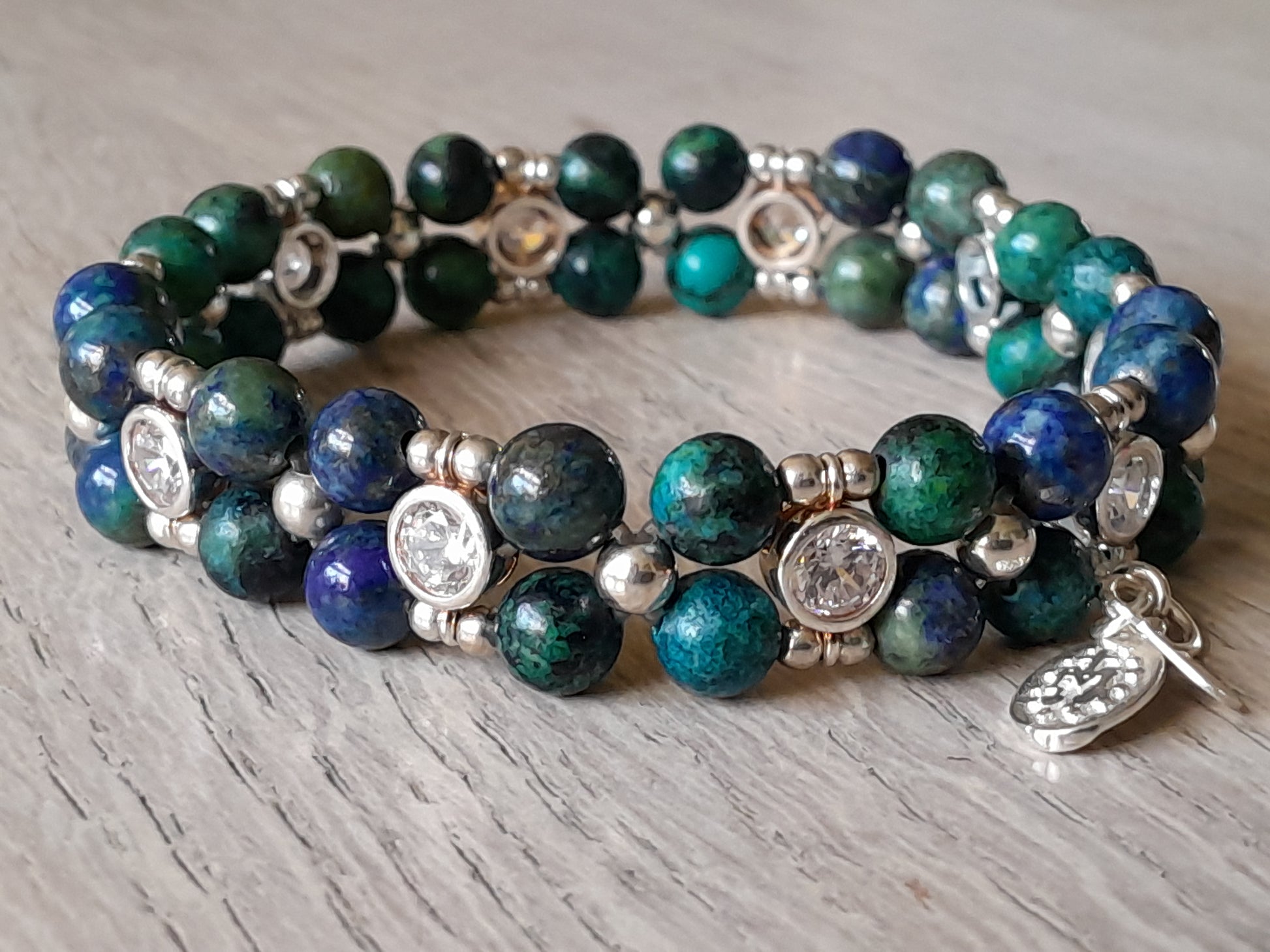 Chrysocolla Bracelet of 6mm gemstone beads, 925 sterling silver and zircon in beautiful natural shades.