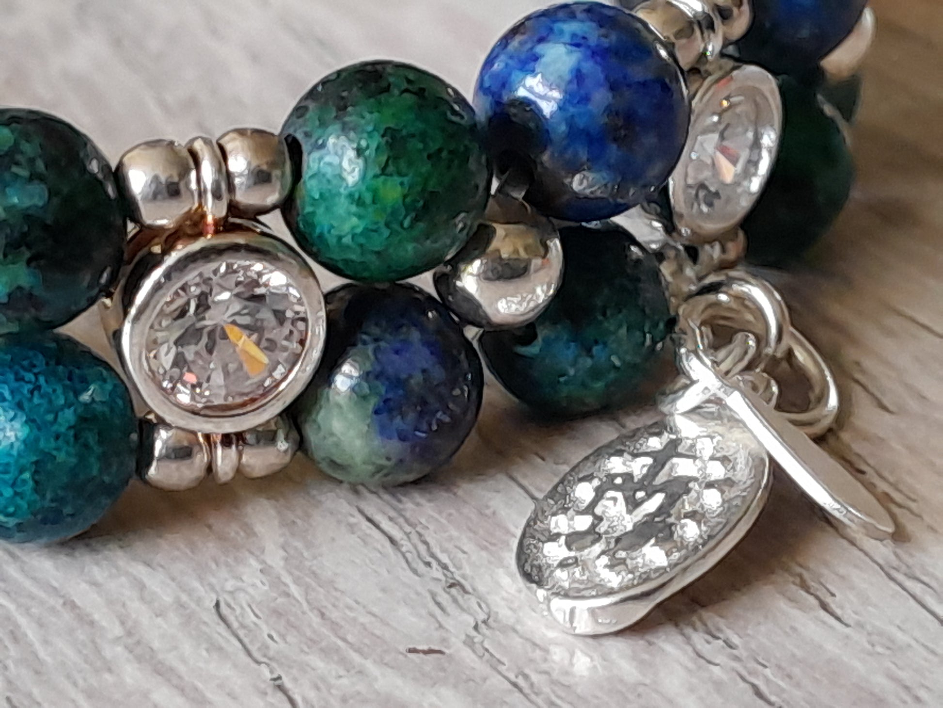 The bracelet has a chic sporty look due to its colour and is a beautiful piece of jewellery. The design feels solid and is 14mm wide. A beautiful bracelet of natural Chrysocolla enriched with 925 silver Zircon spacers and sterling 925 silver beads. The bracelet is strung with durable elastic so that it is easy to wear and also ensures that the bracelet fits beautifully around the wrist. The elastic has a thickness of 1mm and is specially designed for a long durability of precious jewellery.