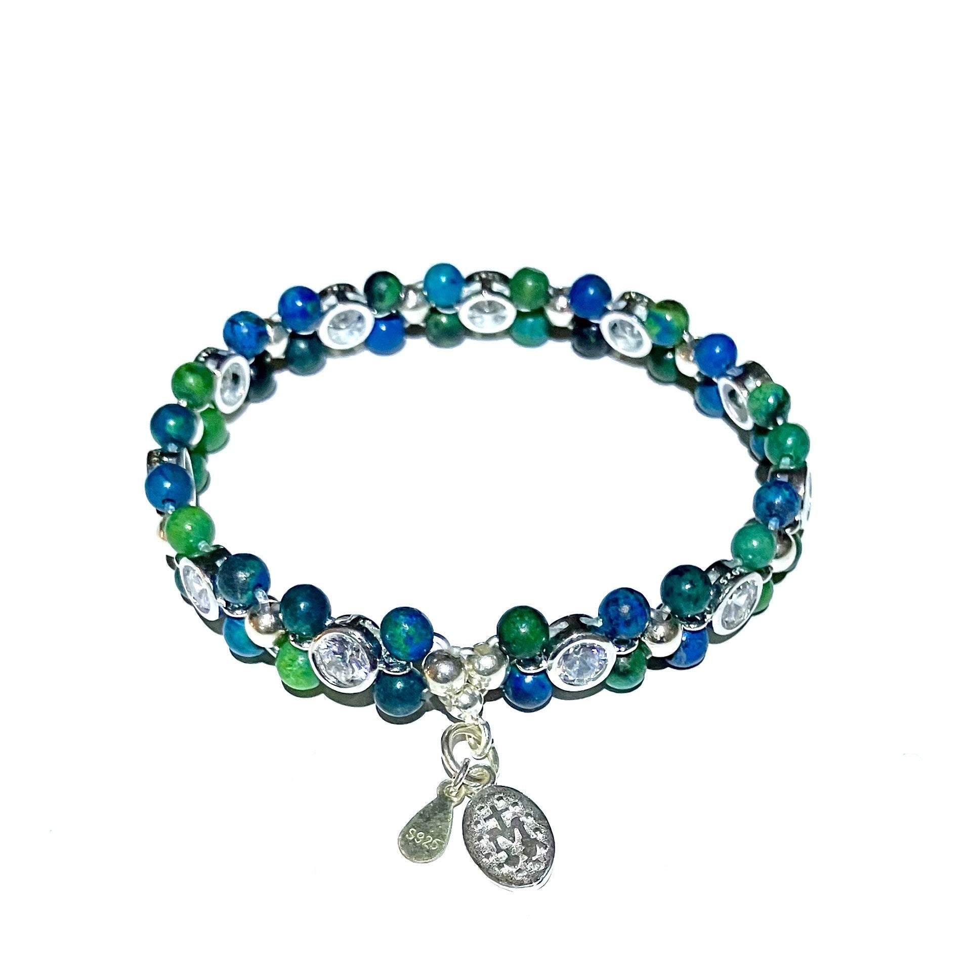A unique and beautiful Chrysocolla ladies bracelet of 4mm gemstone beads, 925 sterling silver with zircon.
